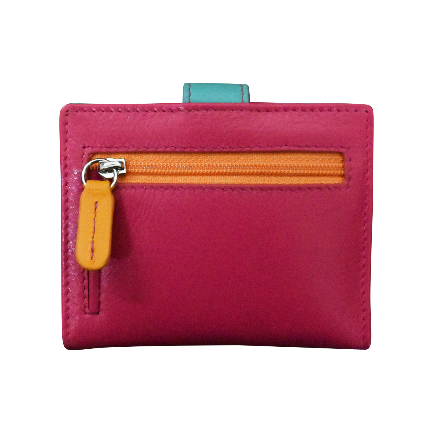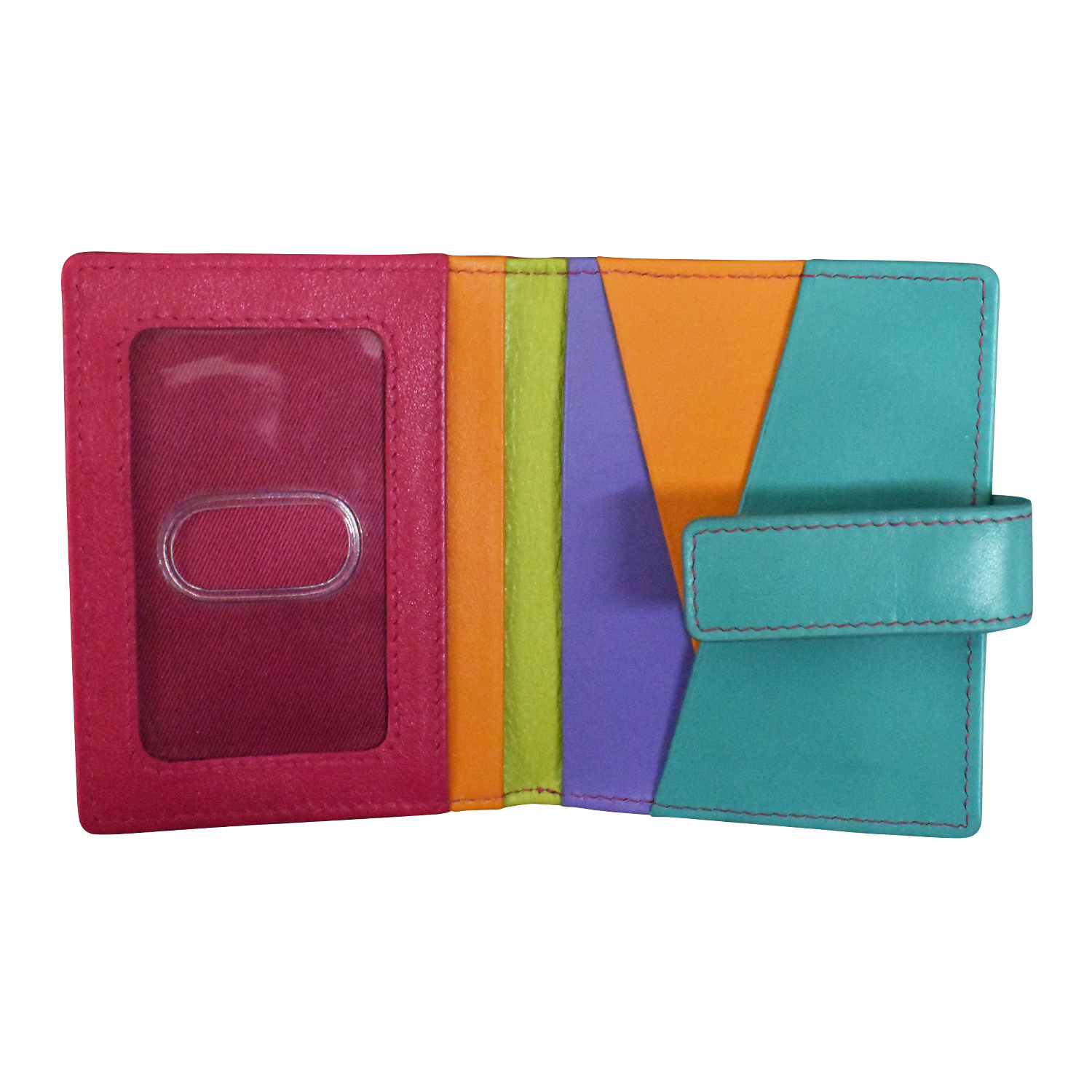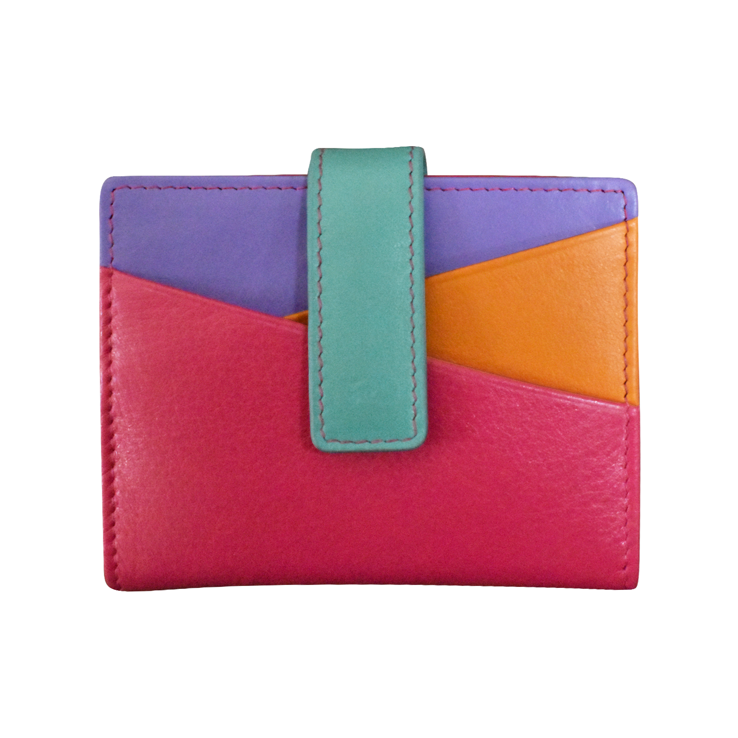 Beautiful leather RFID card case wallet with 2 card slots outside. Inside an ID window and 2 additional slots and slip pockets. Back offers a zip coin pouch and has a tab closure.