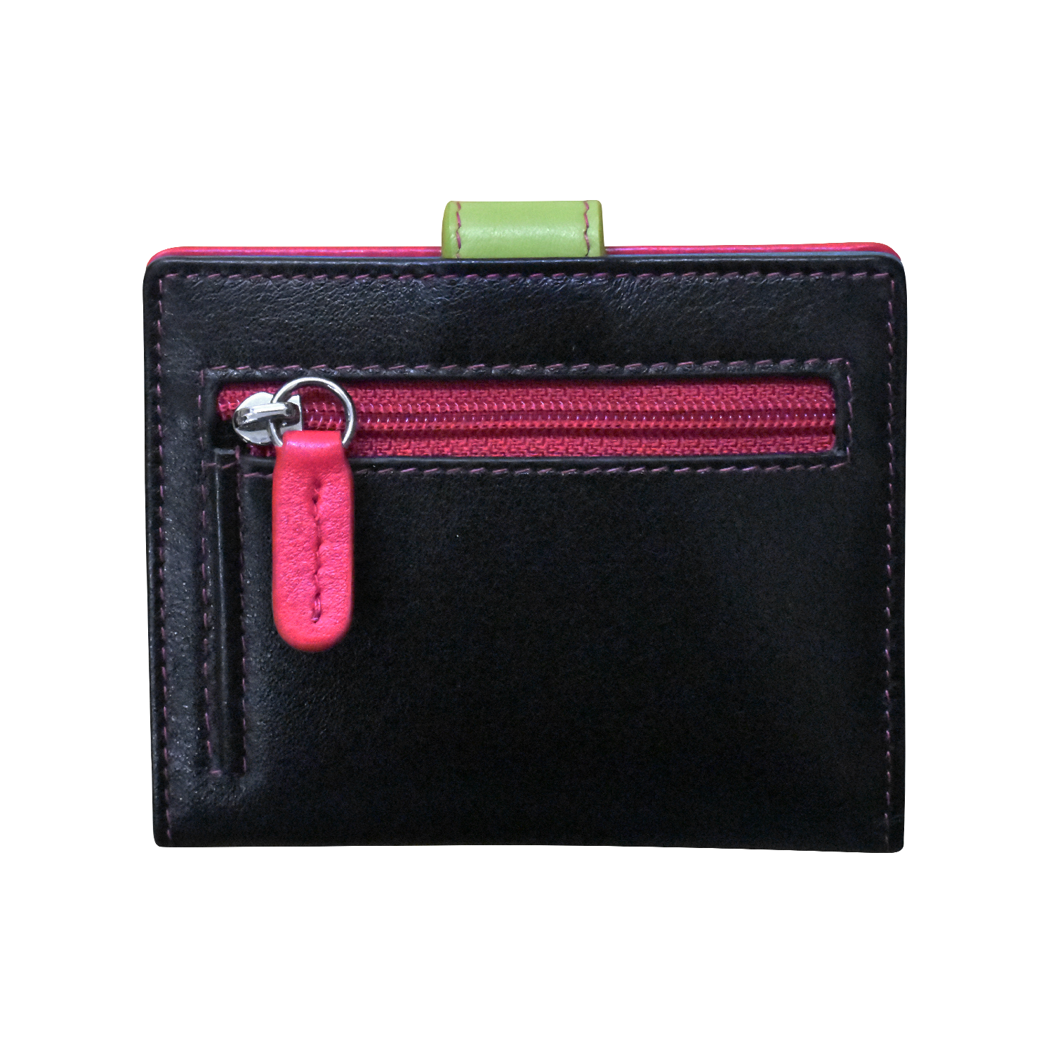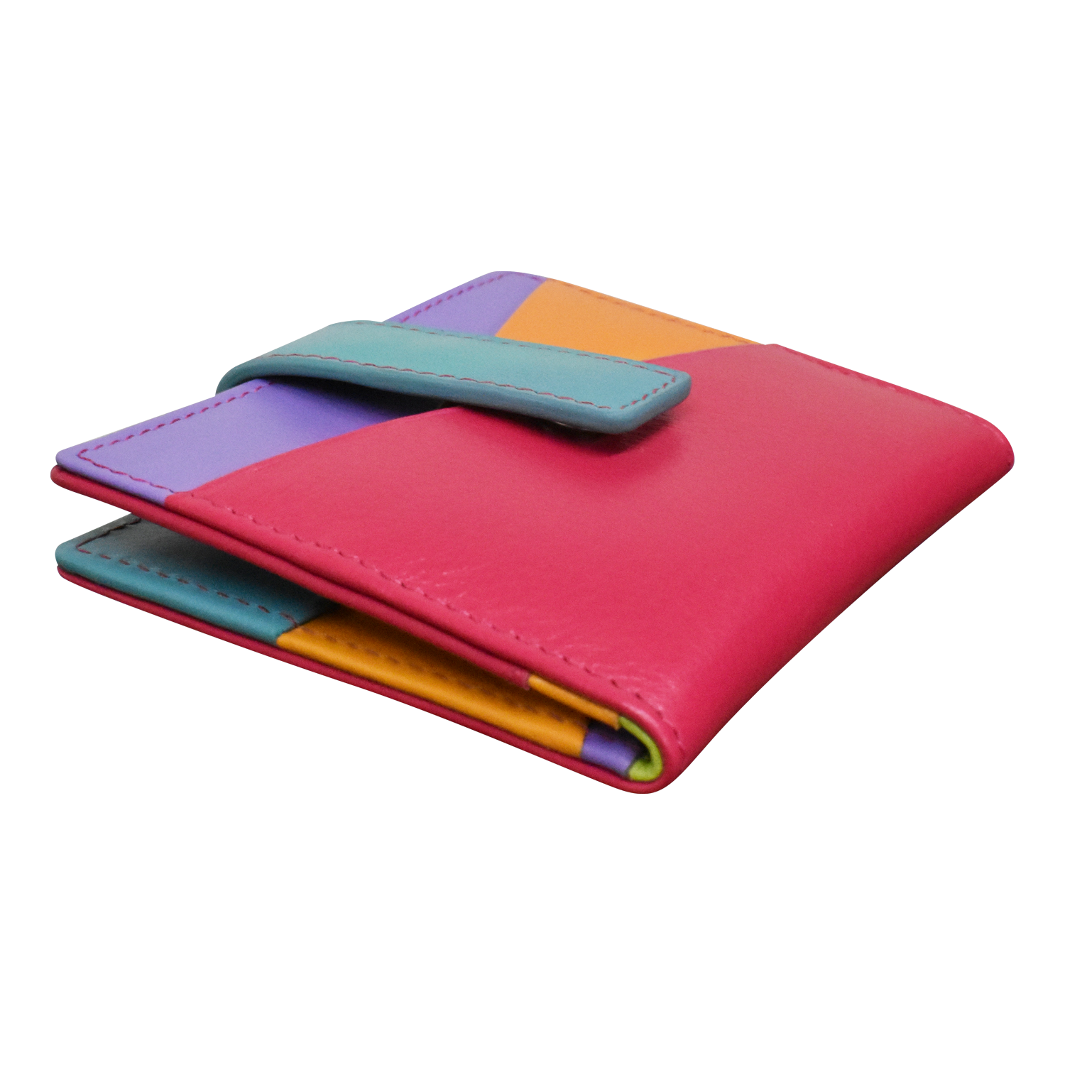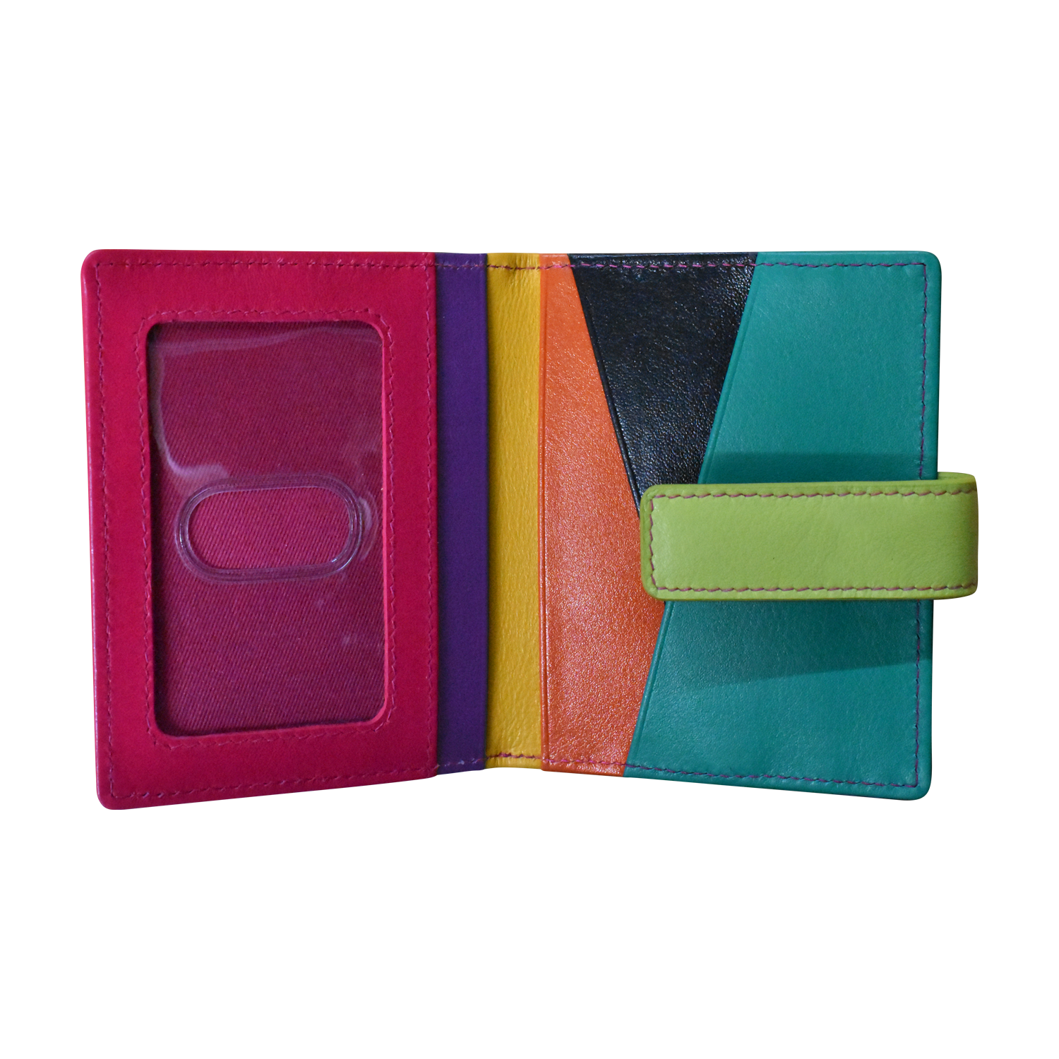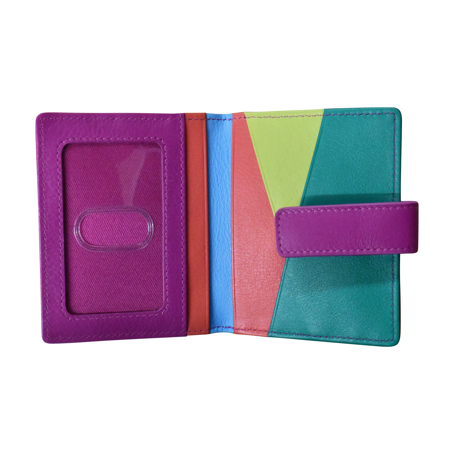 Beautiful leather RFID card case wallet with 2 card slots outside. Inside an ID window and 2 additional slots and slip pockets. Back offers a zip coin pouch and has a tab closure.