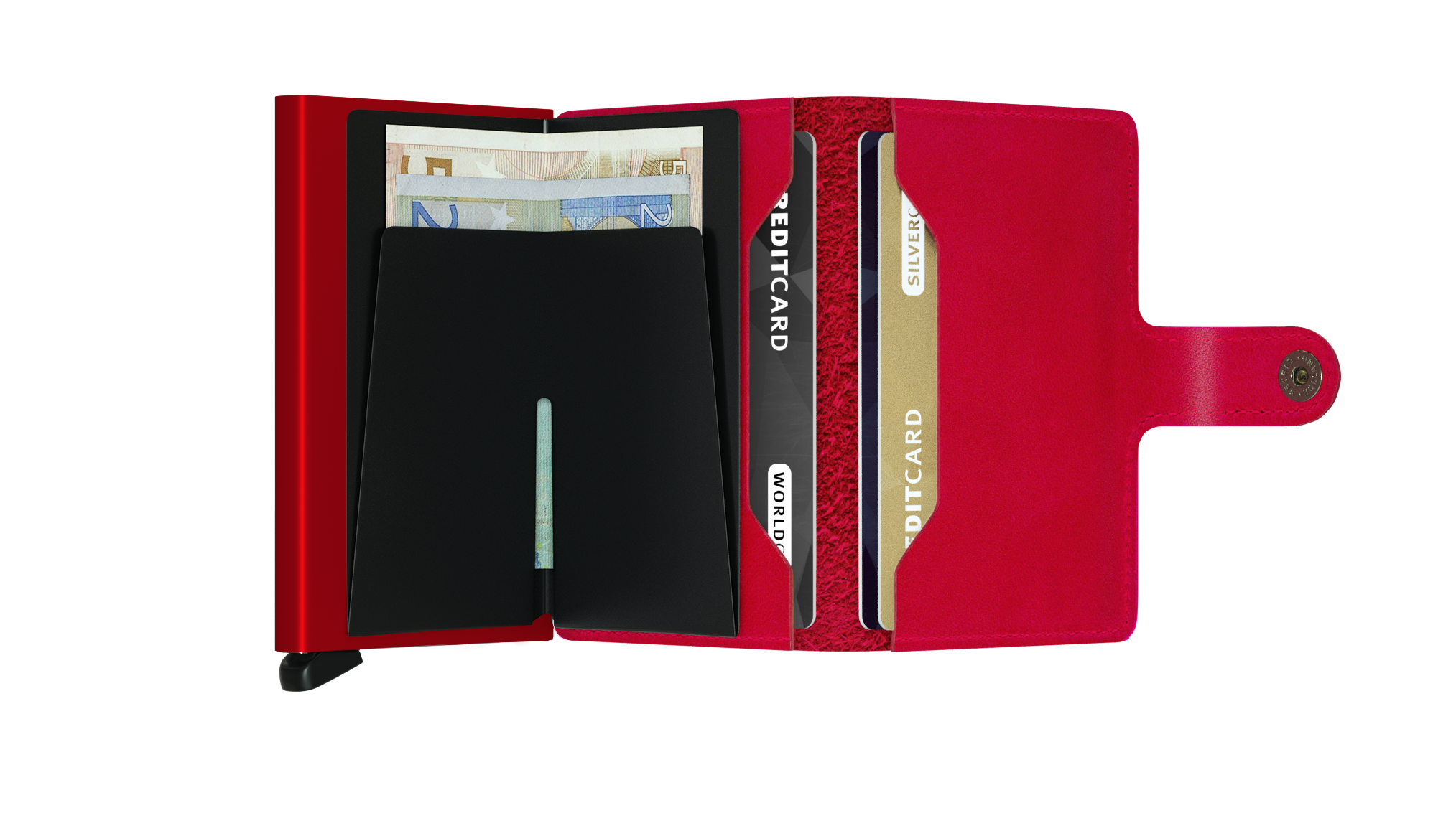Small in size and surprisingly large in storage capacity, the Miniwallet combines the best of both worlds. The exterior holds banknotes, receipt and cards, while the aluminum Cardprotector allows you to slide out cards with one simple motion and protects them from bending, breaking and unwanted wireless communication.