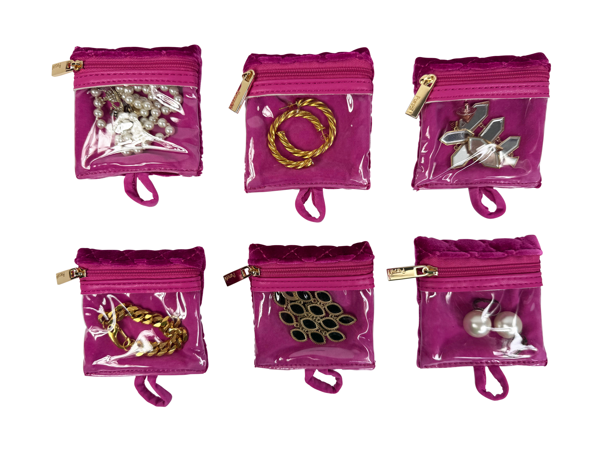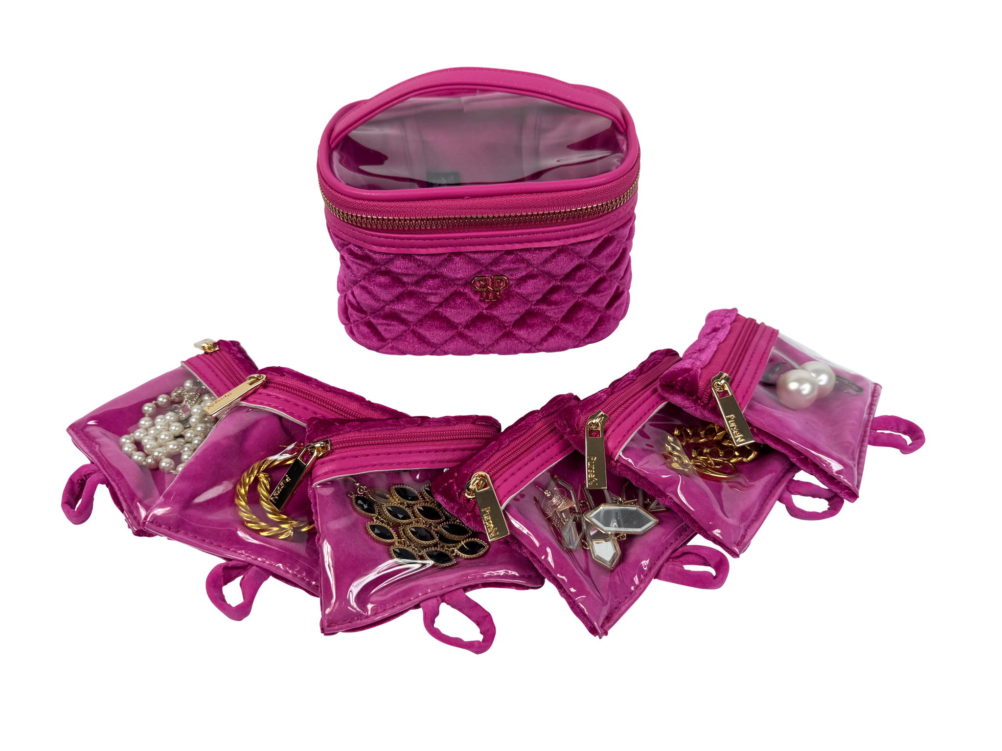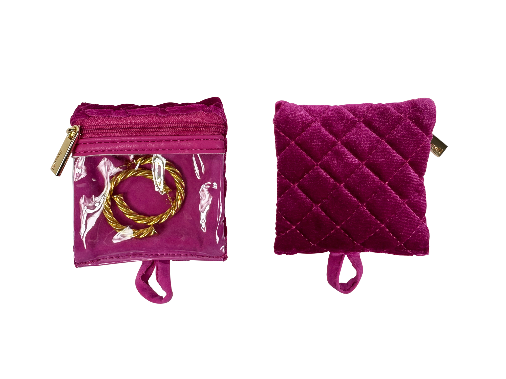 The Getaway Jewelry Case in beautiful Fuchsia Velvet is the perfect travel case for keeping small to medium jewelry from getting lost or tangled at home or on-the-go. Nothing is more frustrating than misplacing one earring from a set you love, and our clear front removable pouches are the solution. Keep your earrings, rings, bracelets and more neatly organized and easy to see.
