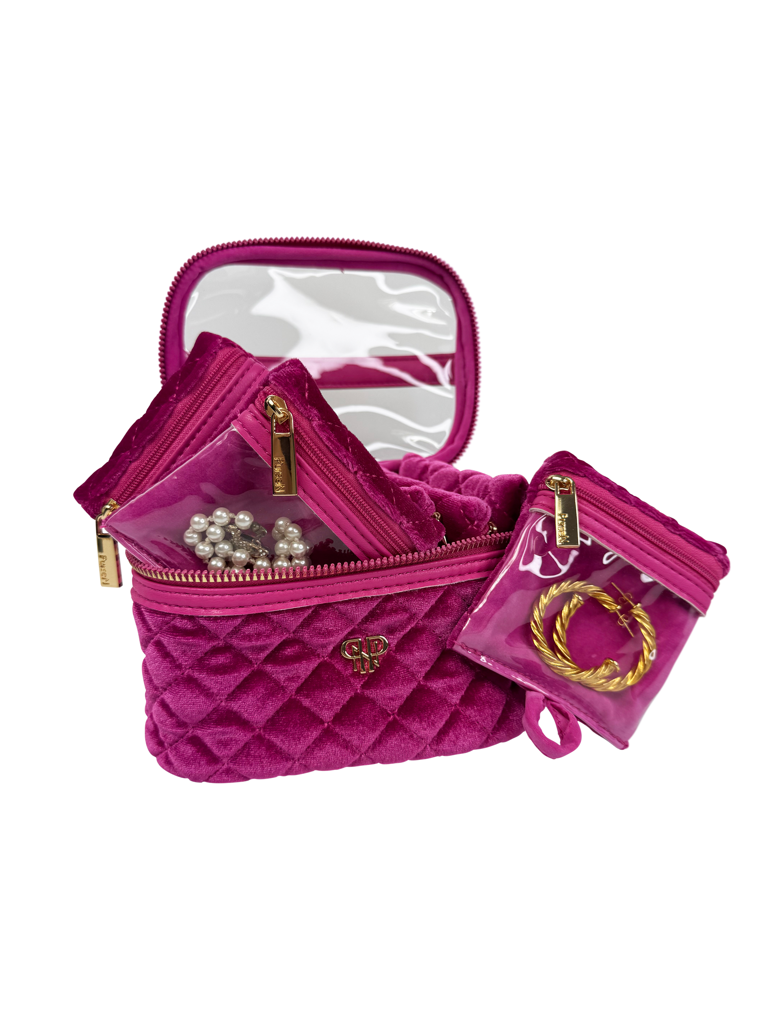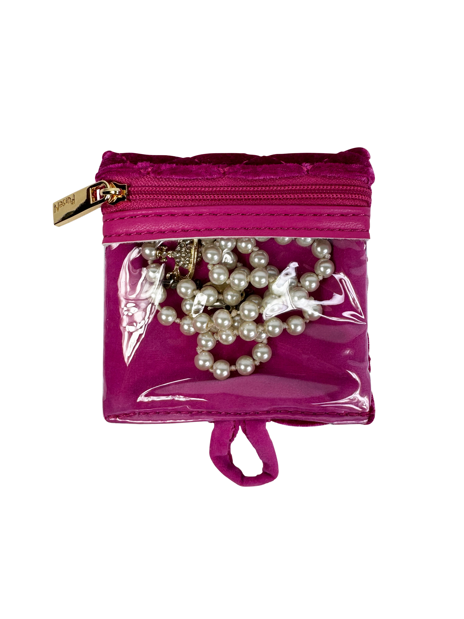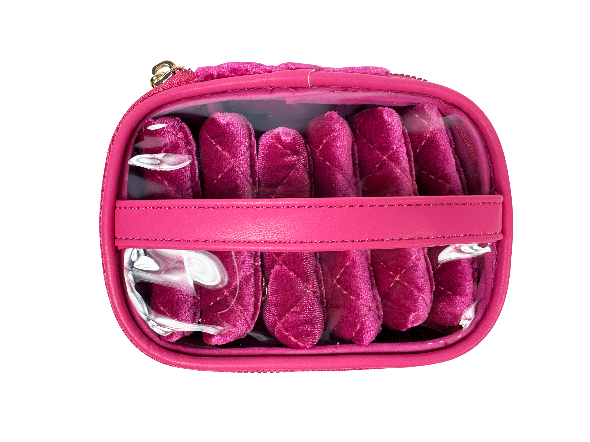 The Getaway Jewelry Case in beautiful Fuchsia Velvet is the perfect travel case for keeping small to medium jewelry from getting lost or tangled at home or on-the-go. Nothing is more frustrating than misplacing one earring from a set you love, and our clear front removable pouches are the solution. Keep your earrings, rings, bracelets and more neatly organized and easy to see.